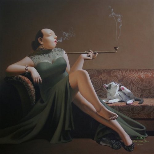 刘宝军的作品画面唯美,擅长把握细节,笔触在细腻之中,还带有一种大度的优雅;在色彩与光影的捕捉上,更是技法独到。他细腻优雅、古典中又略带趣味的画风,让“抽烟斗的女人们”成为艺术市场中炙手可热的作品,画中人物或坐、或立、或卧、或伏案、或枕臂、或翘首,在慵懒悠闲的氛围中,流露出恬静舒适的美感,也因此被誉为中国当代最具代表性的画家之一。