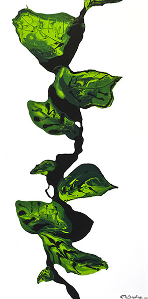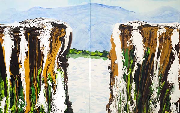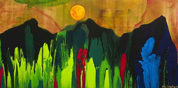Ma Sing Ling玛馨玲的创作特色为“充分挑战油彩的流动与自由性,随着油彩不可预测的自由流转,展现大自然的律动与壮阔!”日盛企业集团总裁陈国和盛赞:“三人合力创作竟能有如此高水平,让我有如同见到张大千泼墨般的惊艳!”本次展出作品,除了延续Ma Sing Ling玛馨玲一贯震慑人心的气势,新创作系列各有不同意涵:“藤达”系列以生生不息的树藤象征着平步青云、腾跃达成之意;“水唱”系列的画中情景,是以古典诗词为发想概念,并充分诠释了唐诗或宋词中对水的生动描述;“金彩蓝得”系列则以悠远神秘的蓝,呈现出山川的各种面貌,加上金色的云彩,顿时点亮万种风情!“水唱.得意山水”系列,则融和中国白描与西方油画的表现手法,另以大面积的金色表现不同的空间层次,既有立体派的神韵,同时又将不同空间表现在同一平面,别具趣味。