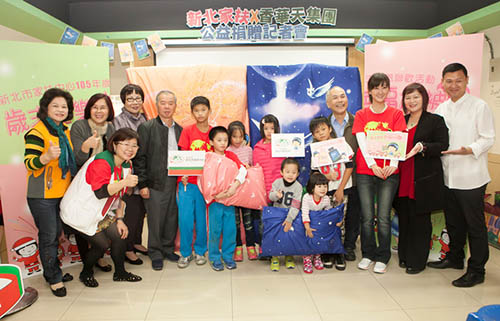 记者会上贵宾们共同揭开捐赠给家扶孩童的岁末礼物-艺术彩绘两用被