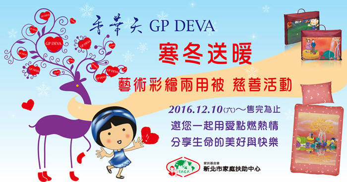 寒冷的冬天躲在暖和的被子里享受,似乎是天经地义的事情,可是台湾仍有不少的弱势家庭,家中拥有一床温暖的被,却是遥远不可能的奢求。长期致力于公益的香华天集团,集团董事长周贝芬体谅弱势家庭孩子的辛苦,2016 年岁末与家扶基金会.新北家扶中心共同发起“寒冬送暖”活动,授权旗下宝胜画廊代理艺术家陈谊欣画作《夜间守护神/带你游世界 》与《雪芽彩/送给你,我的甜蜜》,并亲自设计童趣温馨的艺术彩绘两用被,温暖守护孩子们,让他们在 2016 年拥有一个温暖“加被”的冬季!