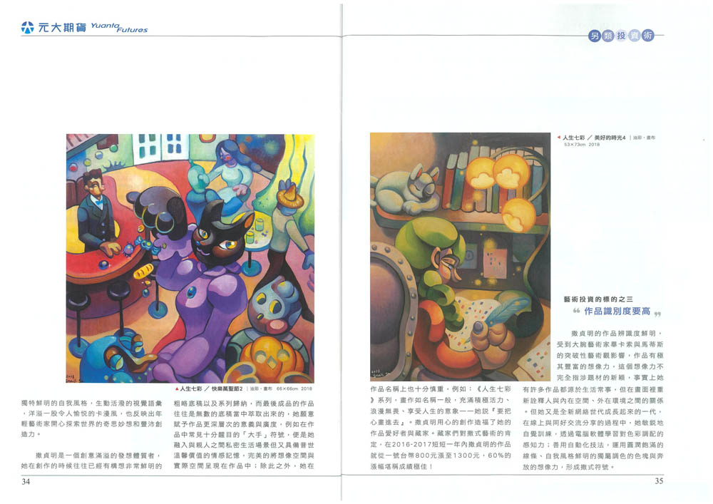 藝術投資的標的之三是作品識別度要高,撒貞明的作品辨識度鮮明,受到大腕藝術家畢卡索與馬蒂斯的突破性藝術觀影響,作品有極其豐富的想像力,這個想像力不完全指涉題材的新穎,事實上她有許多作品都源於生活常事,但在畫面裡重新詮釋人與內在空間、外在環境之間的關係。但她又是全新網絡世代成長起來的一代,在線上與同好交流分享的過程中,她敏銳地自覺訓練,透過電腦軟體學習對色彩調配的感知力;善用自動化技法,運用圓潤飽滿的線條、自我風格鮮明的獨屬調色的色塊與奔放的想像力,形成撒式符號。
