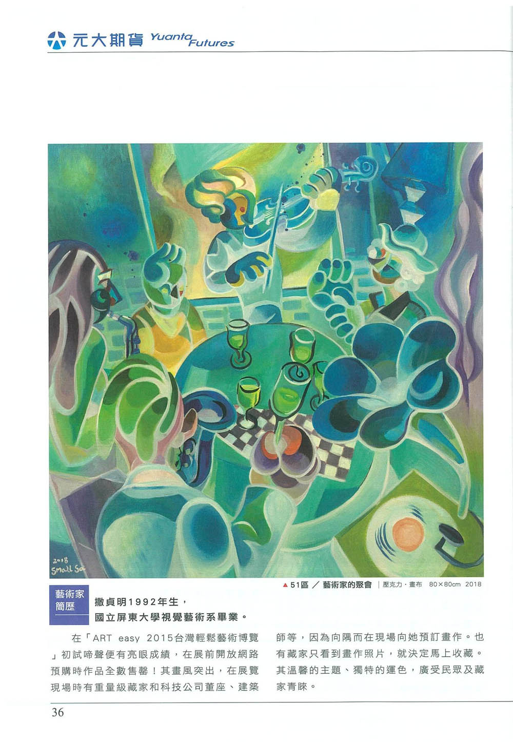 藝術投資的標的之二,藝術家的學經歷。 撒貞明,這位從小立志成為畫家潛力無窮的新銳,她大學時期油畫課程的基礎功夫對於她往後的創作受益匪淺,而長期漫畫編繪創作、幼年時期作品發表販售的經驗、本科系主修3D動畫設計的背景更為她在創作視角融入了不少新意,逐漸摸索出獨特的風格塑造自己的價值。大二時修人體素描課,讓她發覺人體弧線之美,往後創作時也不自覺循著「弧」的軌道走!鮮豔色彩結合現代時尚感的幾何圖形,交織出獨特鮮明的自我風格,生動活潑的視覺語彙,洋溢一股令人愉悅的卡漫風,也反映出年輕藝術家開心探索世界的奇思妙想和豐沛創造力。